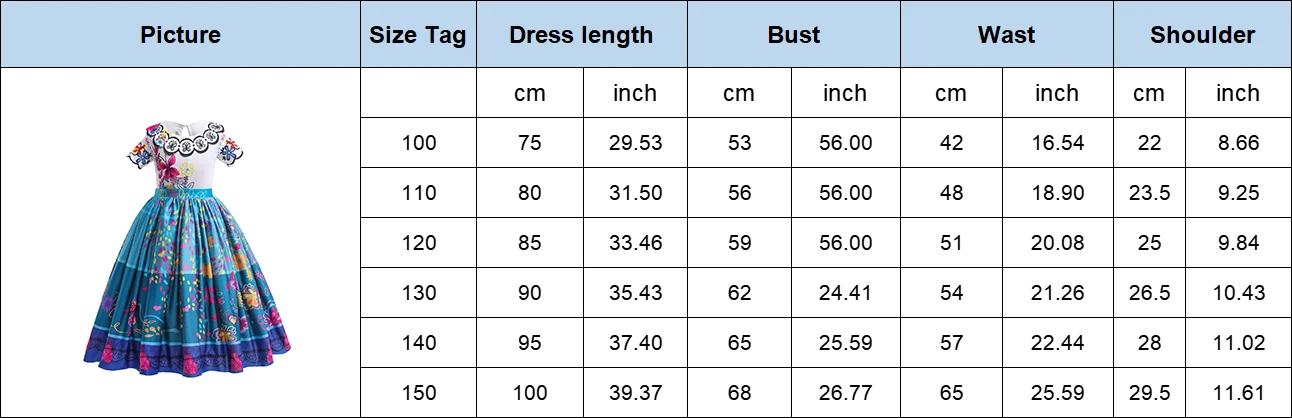 In summary, our Disney Encanto Costume Dress is more than just an outfit; it’s an invitation to step into the enchanted world of Mirabel and her family. With comfortable fabric, various sizing options, and also easy care, it’s a practical choice for parents. Let your child’s imagination run wild and order this dress today for a memorable and magical experience!